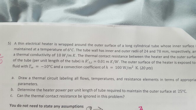 In order to continue enjoying our site we ask that you confirm your identity as a human. The thermal contact resistance between the heater and the outer surface of the tube per unit length of the tube is. A thin electrical heater is wrapped around the outer surface of a long cylindrical tube.